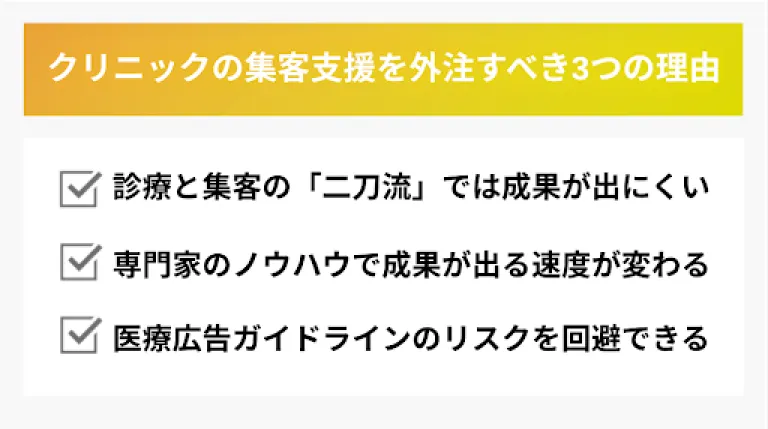 そこで注目されているのが、集客支援を外部の専門会社に委託する「外注」という選択です。ここでは、クリニックが集客支援を外注すべき3つの理由を詳しく解説します。