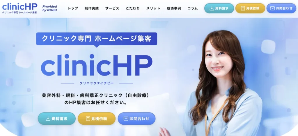clinic HP(クリニックエイチピー)は、千葉県柏市に拠点を置く株式会社NOBUが運営するクリニック専門のホームページ制作サービスです。美容クリニック・歯科・眼科など幅広い診療科に対応し、ホームページ制作からSEO・MEO・広告運用までトータルサポート。