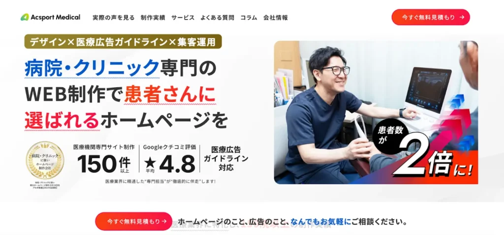 | Acsport Medical(株式会社Acsport) | ホームページ制作・SEO・MEO・SNS運用 | 150院以上の実績・医療DXや大手コンサル出身チームによる予約導線最適化 | 初期費用:70万円〜 月額2万円〜 |