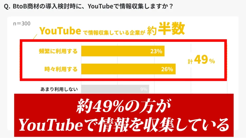 また、BtoB商材を検討する顧客の約49%がYouTubeで情報収集を行っており、動画活用は「やって当たり前」の時代へ移行しつつあります。