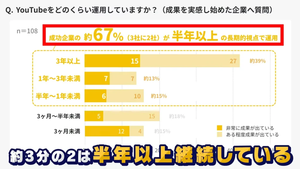 調査によると、YouTube運用で成果を出している企業の約67%(3社に2社)が半年以上継続しています。