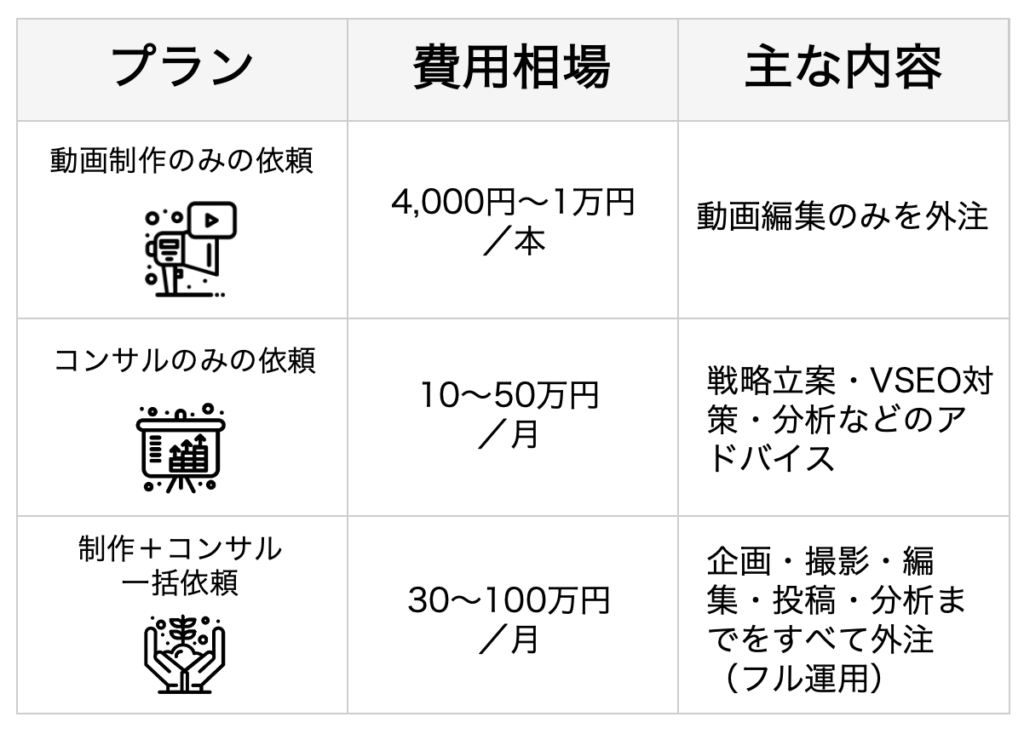 月3〜5万円の動画編集のみから、月200万円を超える本格的な運用まで、価格帯によってできることは大きく異なります。
