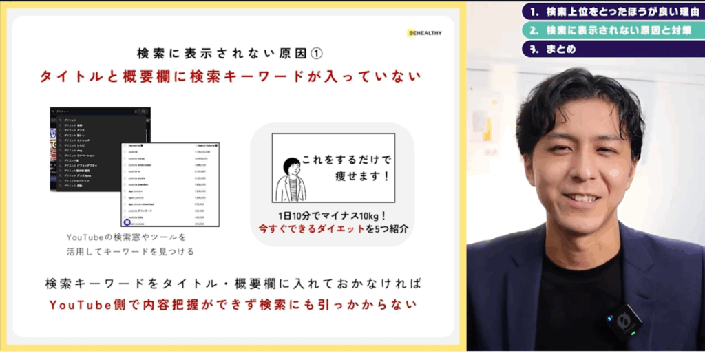 検索で確実に拾ってもらうためには、タイトルと概要欄の両方にキーワードを入れることが重要です。