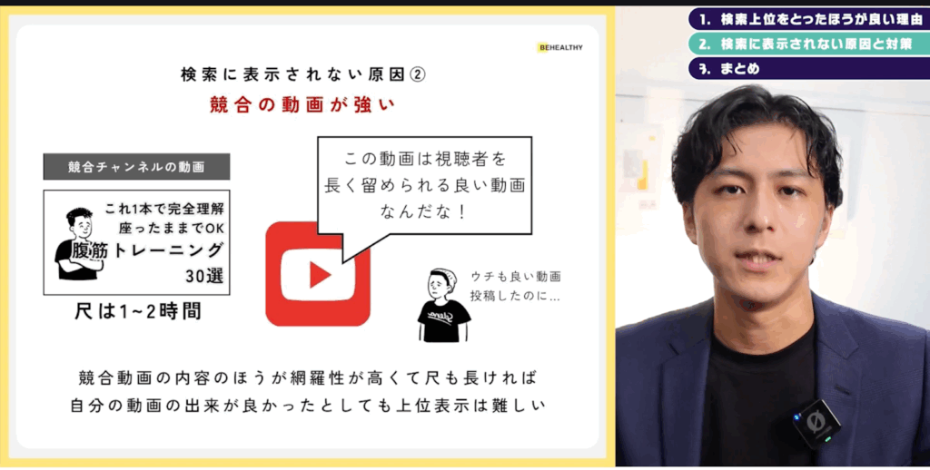 自社の動画が一定の成果を出していたとしても、それを上回る評価を獲得している競合動画が存在すれば、検索順位ではそちらが優先されます。