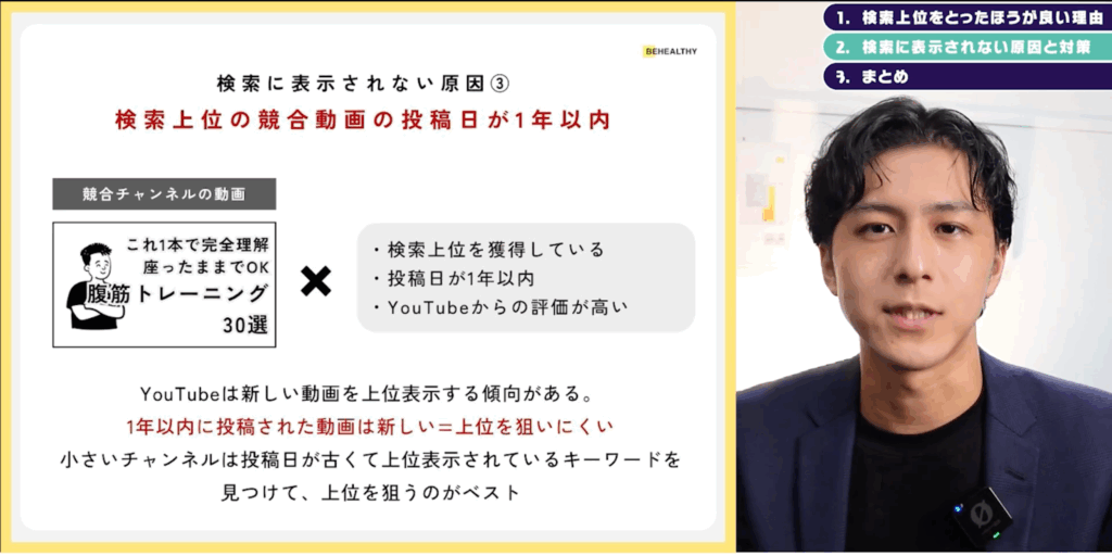 新しく、かつ質の高い動画のほうが評価されやすく、検索上位を塗り替えやすい傾向にあります。